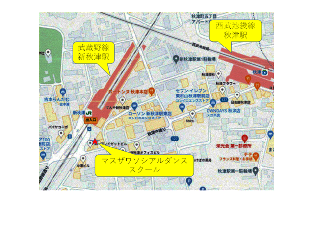 当教室はJR武蔵野線の新秋津駅前にあります。駅の出口から見て駅前ロータリーの左側です。