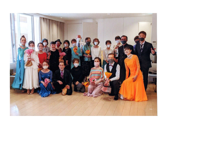 2021年4月10日:、当教室主催の春のダンスパーティーが開催されました。写真は参加メンバーです。食事会や11組のデモンストレーションもあって、和気あいあいの楽しいパーティーでした。